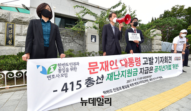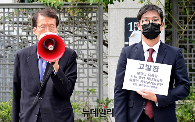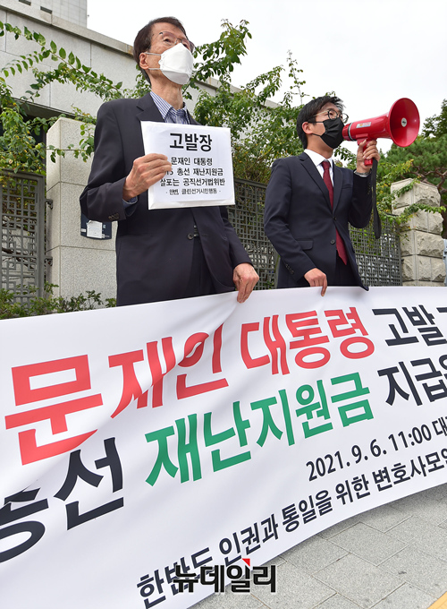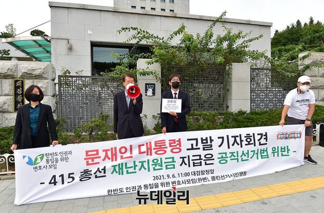 김태훈 한반도인권과 통일을위한변호사모임 상임대표와 유승수 클린선거시민행동 상임대표가 6일 오전 서울 서초구 대검찰청 앞에서 문재인 대통령을 공직선거법 위반 혐의로 대검찰청에 형사 고발하며 기자회견을 갖고 있다.이들은 강민석 전 청와대 대변인이 최근 출간한 '승부사 문재인'에 의하면 문 대통령 은 초기 1차 재난지원금 지급을 준비하면서 당시 김상조 정책실장과 이호승 경제수석에게 "신신당 부하고 싶다. 경제가 아니라 정치경제를 할 때다. 재난지원금 지급을 총선 이후로 미룰 수는 없다. 정책은 타이밍이 중요하다"며 홍남기 경제부총리에게 "비상대권을 가졌다고 생각하라"고 재촉한 것이 재난지원금으로 제21대 총선에 영향을 주려고 했다고 주장했다.