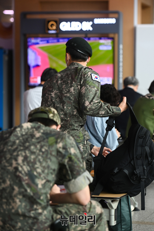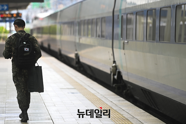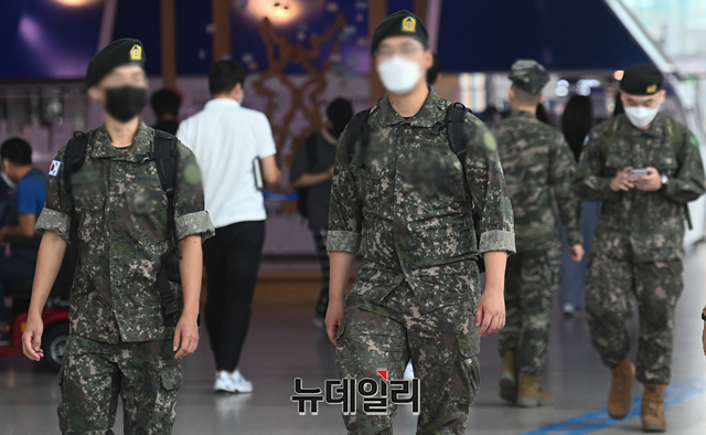 코로나19 확산으로 장기간 동안 축소 시행되거나 일부 중단됐던 군 장병 휴가가 정상 시행된 6일 오전 서울역을 찾은 국군장병이 KTX 열차를 타기 위해 발걸음을 옮기고 있다.