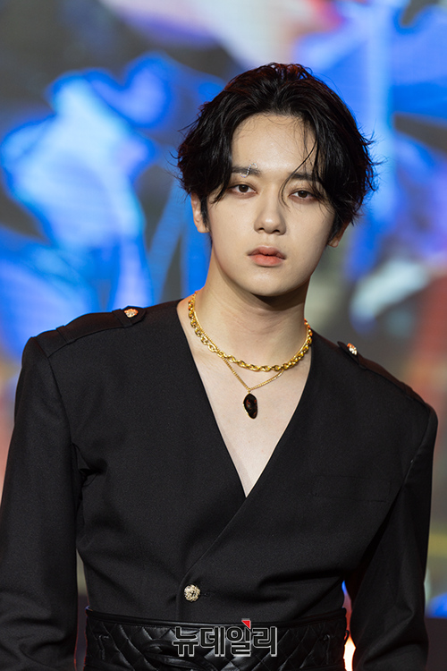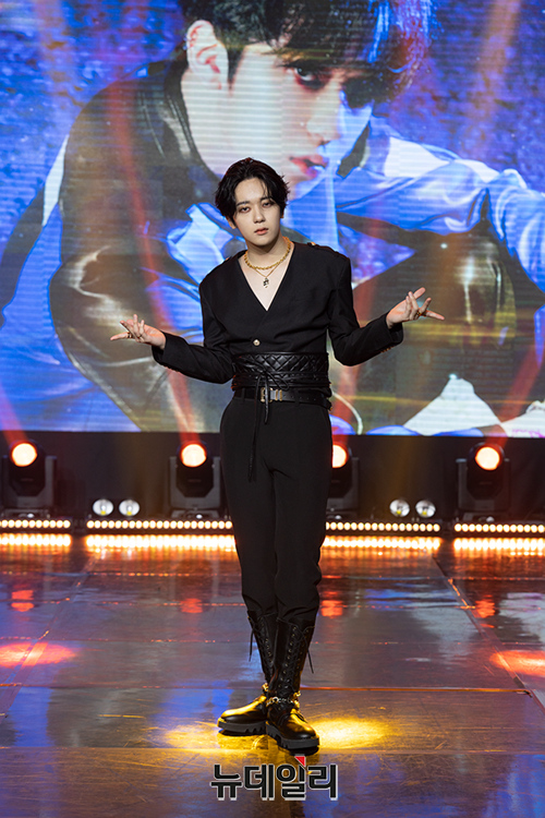 아이돌그룹 오메가엑스 멤버 예찬이 6일 오후 온라인으로 열린 첫 번째 싱글 'WHAT'S GOIN' ON' 쇼케이스에서 포토타임을 갖고 있다.