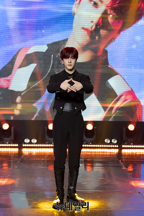 아이돌그룹 오메가엑스 멤버 정훈이 6일 오후 온라인으로 열린 첫 번째 싱글 'WHAT'S GOIN' ON' 쇼케이스에서 포토타임을 갖고 있다.