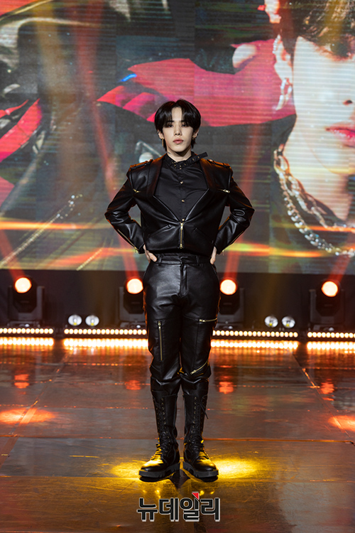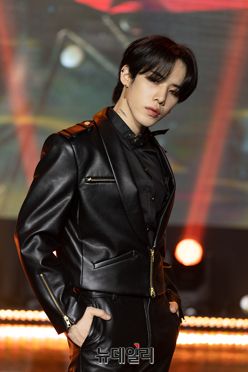 아이돌그룹 오메가엑스 멤버 젠이 6일 오후 온라인으로 열린 첫 번째 싱글 'WHAT'S GOIN' ON' 쇼케이스에서 포토타임을 갖고 있다.