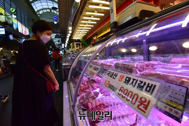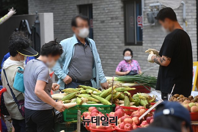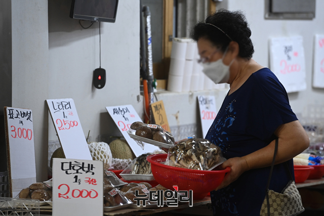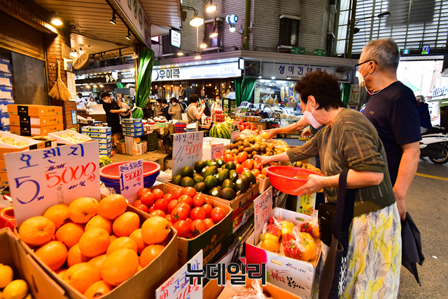 민족 최대의 명절인 추석을 앞둔 6일 오후 서울 마포구의 한 전통시장을 찾은 시민들이 과일과 채소를 살펴보고 있다.