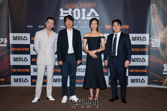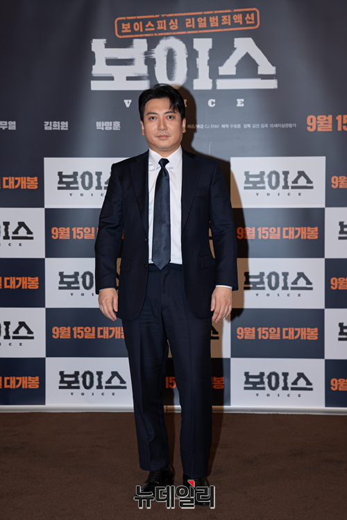 배우 박명훈이 6일 오후 서울 용산구 CGV 용산아이파크몰에서 열린 영화 '보이스(감독 김선 김곡)' 언론시사회에서 포토타임을 갖고 있다.