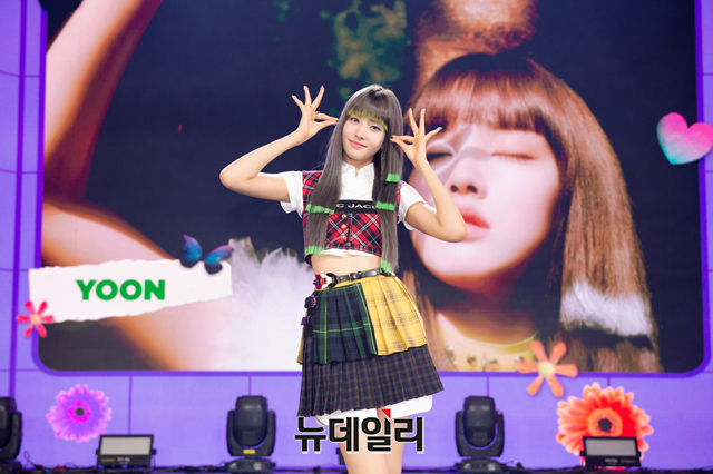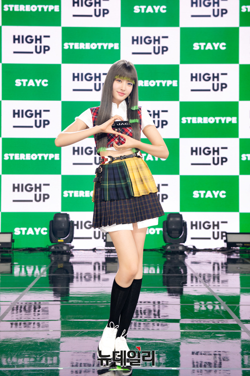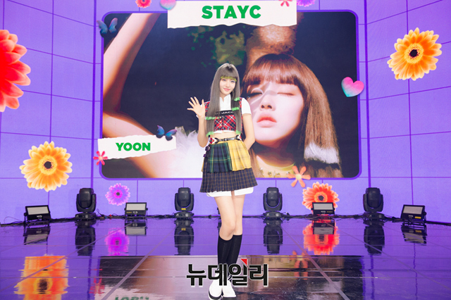 걸그룹 스테이씨(STAYC) 멤버 윤이 6일 오후 온라인으로 진행된 첫 번째 미니앨범 '스테레오타입(STEREOTYPE)' 발매 기념 온라인 쇼케이스에서 포즈를 취하고 있다.