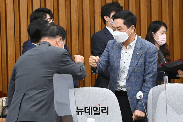 김기현 국민의힘 원내대표가 7일 오전 국회에서 열린 원내대책회의에 참석해 의원들과 인사를 나누고 있다. (사진=공동취재단)