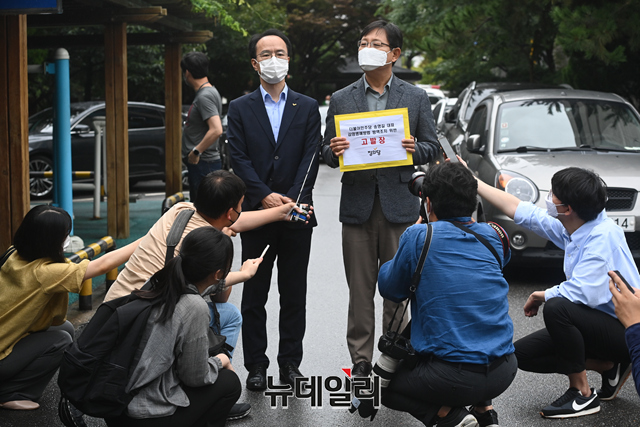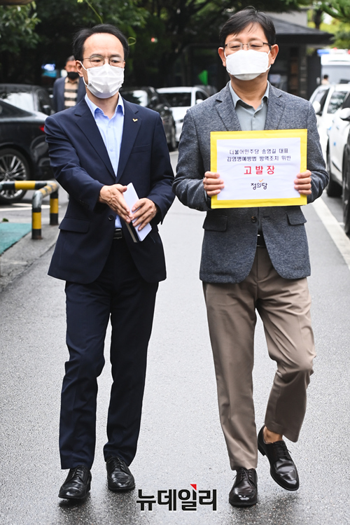 이동영 정의당 수석대변인(왼쪽)과 신언직 사무총장이 7일 오후 서울 영등포경찰서를 찾아 더불어민주당 충청권 지역 순회 경선에서 방역지침을 위반했다고 주장하며 송영길 당대표를 고발했다.