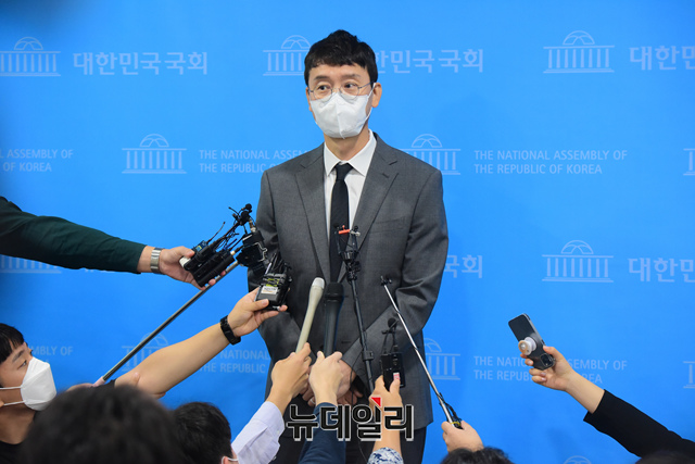 김웅 국민의힘 의원이 8일 오전 국회 소통관에서 '윤석열 전 검찰총장 여권 인사 고발 사주 의혹' 관련 기자회견을 마치고 기자들의 질문에 답하고 있다.