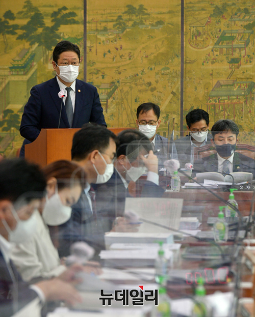 황희 문화체육관광부 장관이 8일 국회에서 열린 문화체육관광위원회 전체회의에 출석해 결산보고를 하고 있다. (사진=공동취재단)