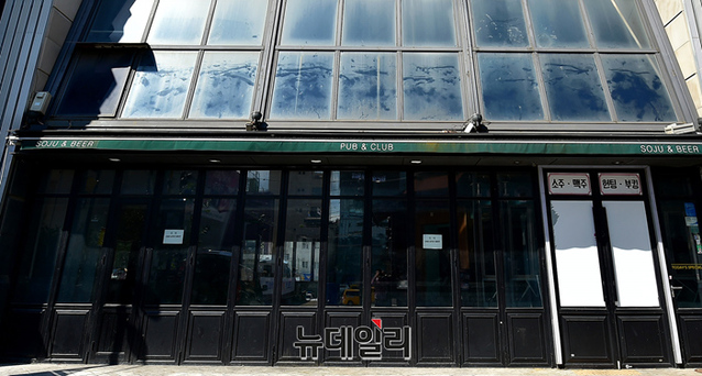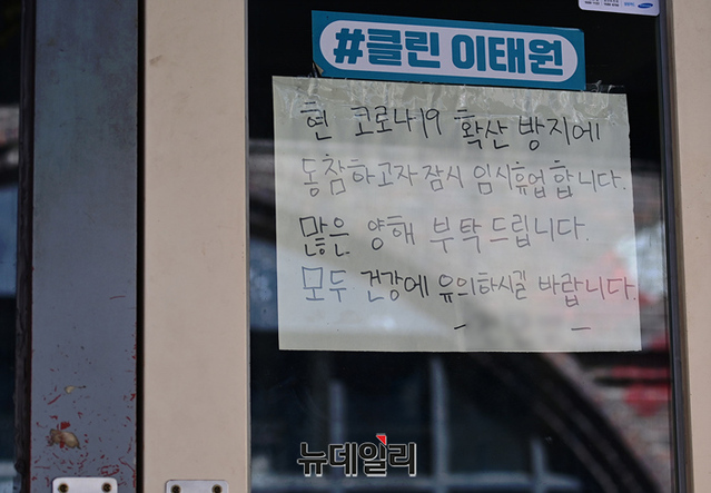 코로나19 여파가 장기화 되고 있는 8일 오후 서울 용산구 이태원 거리에서 쉽게 찾을 수 있는 폐업한 상점의 간판 흔적. 상점 입구에는 '임시휴업'과 '폐점' '임대'를 알리는 안내문구도 쉽게 찾을 수 있다. 붐비던 거리도 찾은 외국인이 줄어 한산한 모습이다.