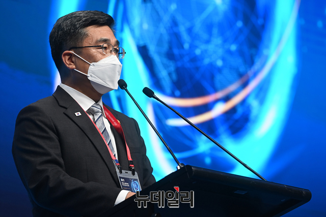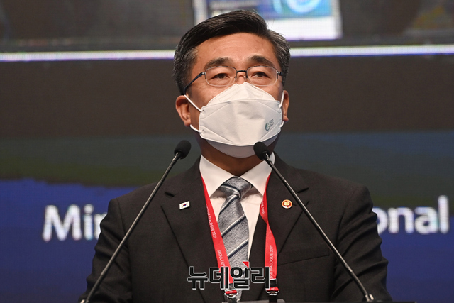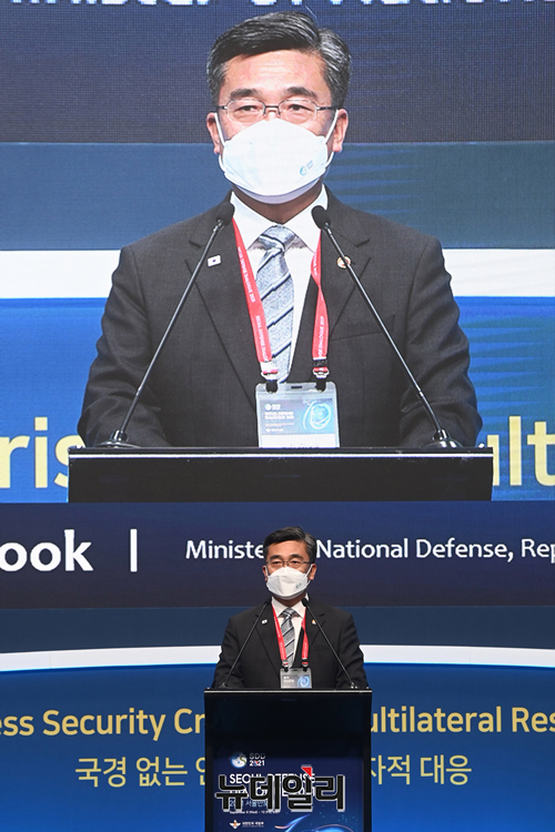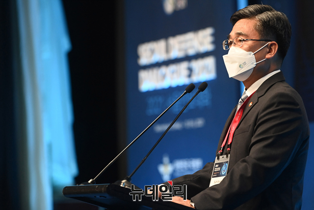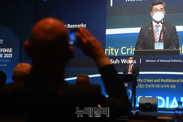 서욱 국방부 장관이 9일 오전 서울 용산구 그랜드하얏트 서울에서 열린 '2021 서울안보대화' 개회식에서 개회사를 하고 있다.
