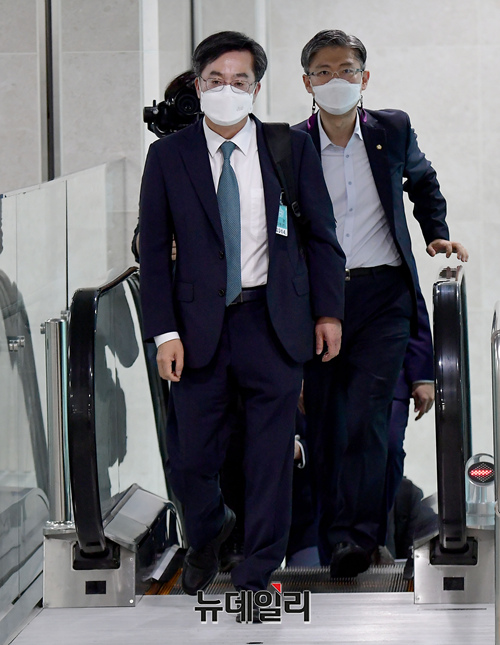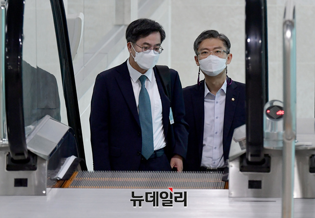 대선 출마를 선언한 김동연 전 경제부총리가 9일 오전 국회 소통관에서 대선 출마 관련 기자회견을 갖기 위해 입장하고 있다.