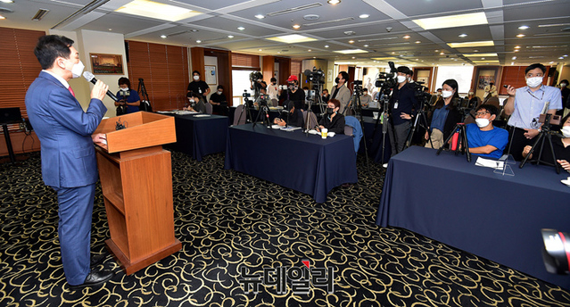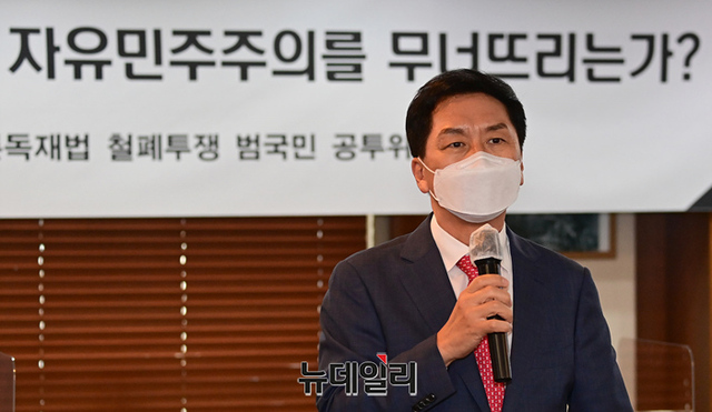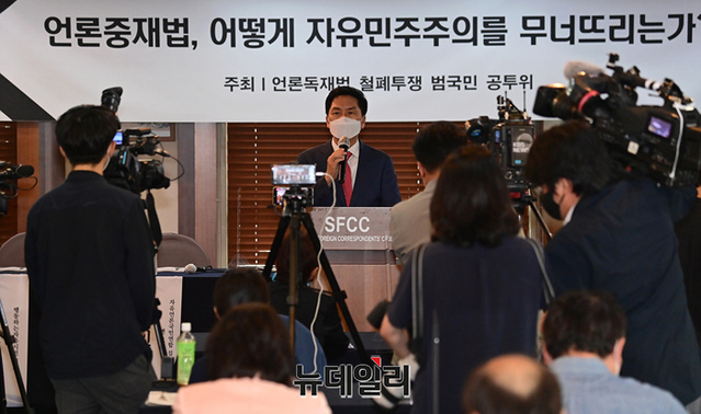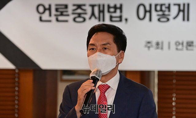 김기현 국민의힘 원내대표가 9일 오후 서울 중구 한국프레스센터에서 언론독재법철폐투쟁을 위한 범국민공투위 주최로 열린 긴급 토론회에서 인사말을 하고 있다.토론회는 '언론중재법, 어떻게 자유민주주의를 무너뜨리는가?'를 주제로 최진녕 변호사와 장세정 중앙일보 논설위원이 각각 발제를 맡았다.이어진 토론에는 박인환 자유언론국민연합 진행위원장, 오정환 MBC노동조합 위원장, 박소영 행동하는자유시민 대표, 유승수 한변 변호사, 조맹기 서강대 명예교수가 나섰다.