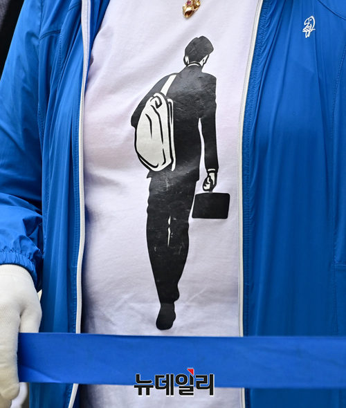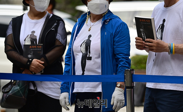 조국 전 장관을 형상화한 티셔츠를 입은 지지자가 10일 오전 서울 서초구 서울지방법원에서 법정에 출석하는 조국을 응원하기 위해 기다리고 있다. 일부 지지자들은 조국 이미지가 새겨진 티셔츠와 보건용마스크, 출간서적, 파란색 복장 등을 착용했다. 조국은 파란색 넥타이를 착용하고 법정으로 향했다.