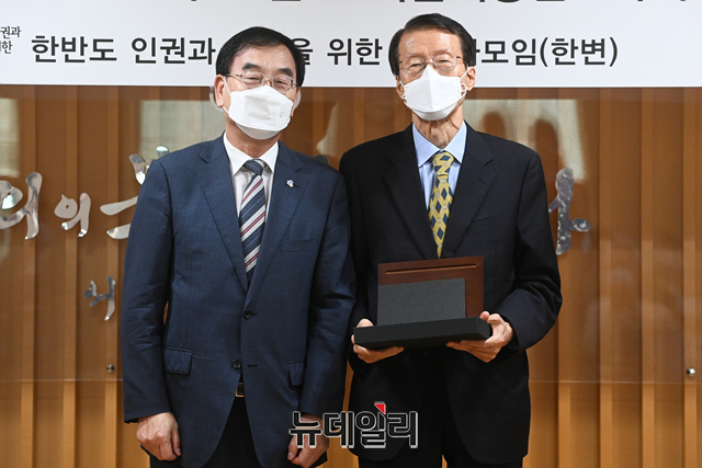 이재원 한변 신임회장(왼쪽)이 10일 오전 서울 서초구 서울지방변호사회관에서 열린 한변 창립 8주년 기념행사에서 김태훈 전임 회장에게 공로패를 수여하고 있다.