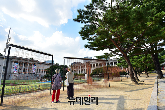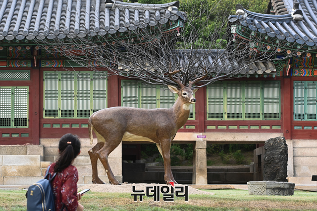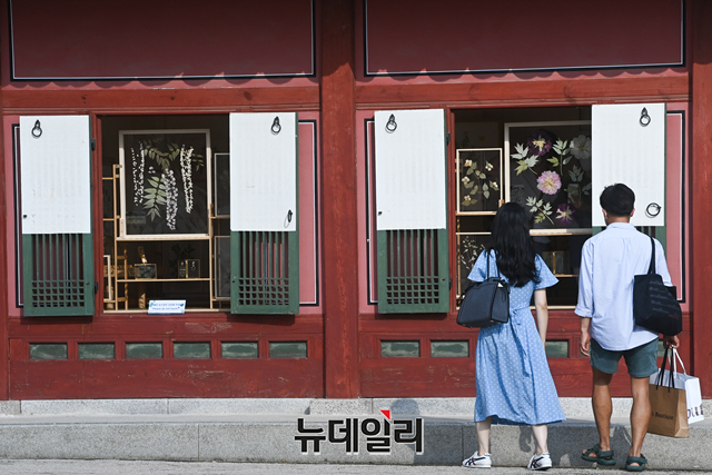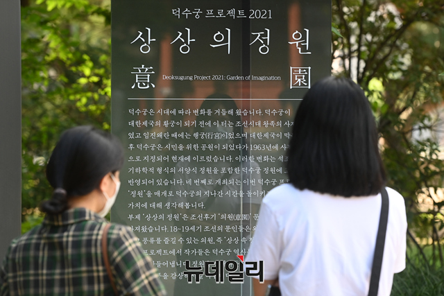 '덕수궁 프로젝트 2021: 상상의 정원'이 개최된 10일 오후 서울 중구 덕수궁을 찾은 관람객이 권혜원 작가의 '나무를 상상하는 방법' 작품을 관람하고 있다.'상상의 정원은'은 담의 안과 밖을 자연스럽게 이어주는 한국의 전통정원을 자연 그대로 즐기기 위한 전시다. 덕수궁 곳곳을 거닐며 '정원'을 매개로 덕수궁의 역사와 문화적 의미를 예술가들 특유의 상상력으로 재해석한 작품을 즐길 수 있다.평소 입장 할 수 없는 덕홍전, 함녕전 안에 직접 들어가 작품을 감상할 수 있다. 11월 28일까지 열린다.
