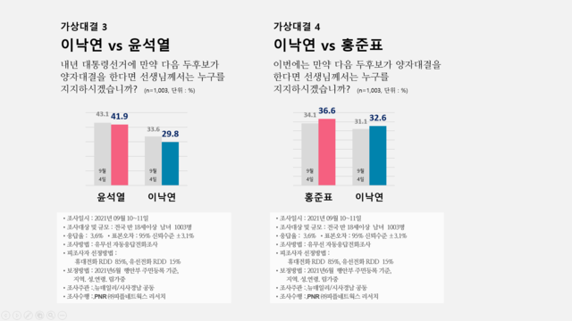 '양자대결' 윤석열 38.9% vs 이재명 33.3%… 윤석열 41.9% vs 이낙연 29.8%'양자대결' 홍준표 34.7% vs 이재명 35.4%… 홍준표 36.6% vs 이낙연 32.6%
