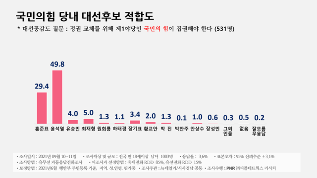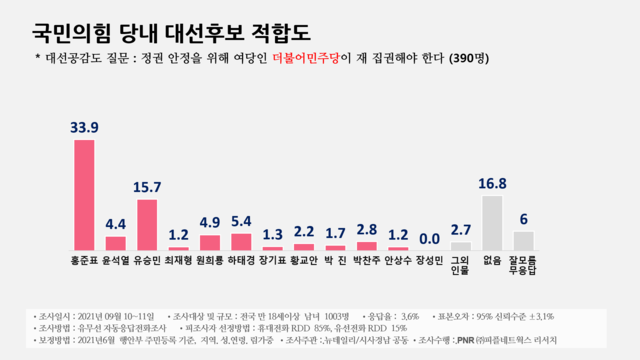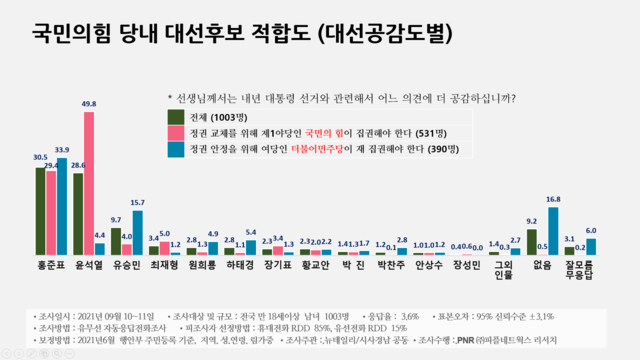 여론조사기관 PNR리서치가 뉴데일리와 시사경남 의뢰로 지난 10~11일 이틀간 전국 만18세 이상 남녀 1003명을 대상으로 대선 여론조사를 실시한 결과, '국민의힘 대선후보 적합도'를 묻는 질문에 응답자의 30.5%가 홍준표 후보를, 28.6%가 윤석열 후보를 지지했다. 뒤를 유승민(9.7%), 최재형(3.4%), 원희룡·하태경(2.8%), 황교안(2.3%) 등 순이었다.특이한 점은 '정권안정(더불어민주당 재집권)'을 바라는 응답자 중 33.9%가 홍준표 후보를, 15.7%가 유승민 후보를 지지한다고 답한 점이다. 같은 그룹의 윤석열 후보 지지율은 4.4%에 불과했다.특히 다자대결에서 이재명 후보를 지지했던 응답자 중 37.7%가 국민의힘 경선 후보만을 대상으로 한 조사에서 홍준표 후보를 지지한 것으로 조사됐다. 다자대결에서 추미애 후보를 지지했던 응답자의 31.1%도 홍 후보를 지지했다.민주당 지지자 중 "다자대결서 홍준표 지지" 2.8%에 불과