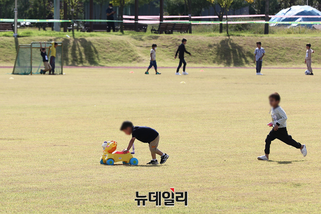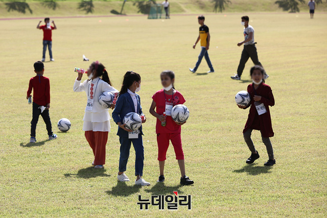 2주간의 자가격리를 끝낸 아프가니스탄 특별 기여자들이 13일 오전 충북 진천군 국가공무원 인재개발원 운동장에서 야외 활동을 하고 있다. (사진=공동취재단)