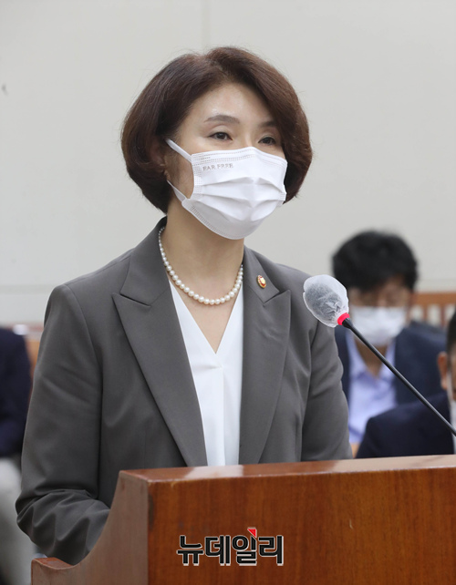한정애 환경부장관이 13일 오전 국회에서 열린 환경노동위원회 전체회의에서 2020회게연도 결산관련 발언을 하고 있다. (사진=공동취재단)