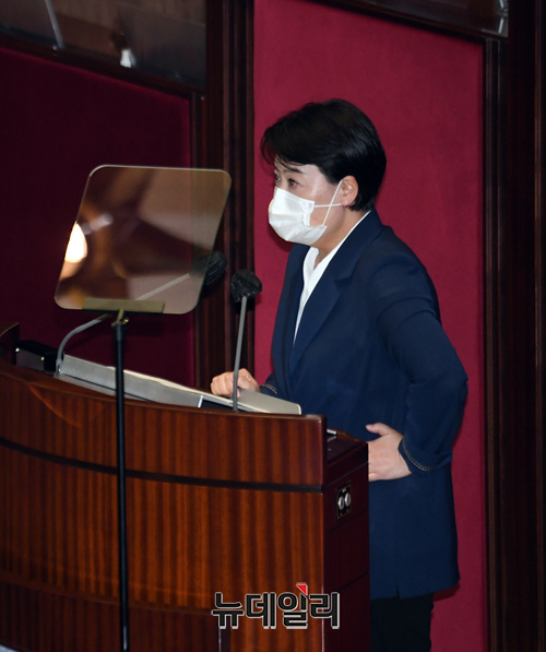 윤희숙 국민의힘 의원이 13일 국회에서 열린 본회의에서 본인의 사직안 상정 전에 신상발언을 하고 있다. (사진=공동취재단)