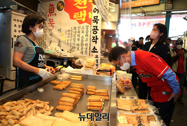 [포토] 롯데 자이언츠 유니폼 입고 부산 부전시장 찾은 최재형