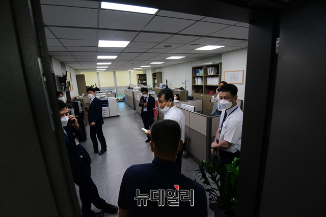 고위공직자비리수사처수사관들이 13일 국민의힘 김웅 의원의 국회 의원회관 사무실로 압수수색을 위해서 대기하고 있다.