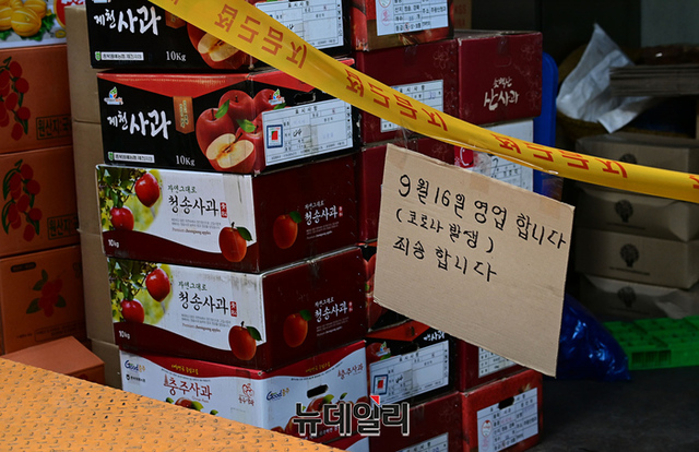추석명절을 앞두고 확진자가 증가하면서 일부 청과물 매장은 시설이용이 폐쇄된 상태다. 반면 시설 폐쇄된 매장을 제외하면 명절 대목을 앞두고 분주한 모습을 보이고 있다.