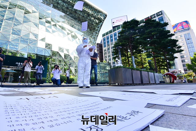 민노총 산하 의료연대본부가 15일 오전 서울시청 앞에서 코로나19 간호인력기준을 발표하지 않는다며 서울시를 규탄하는 기자회견을 갖고 있다.