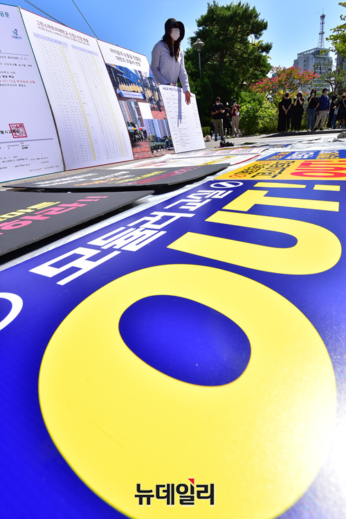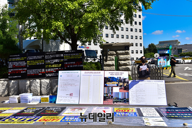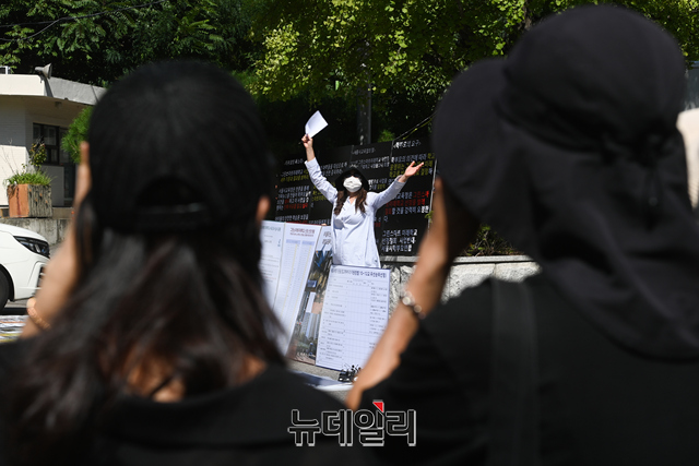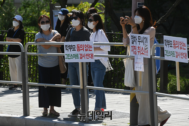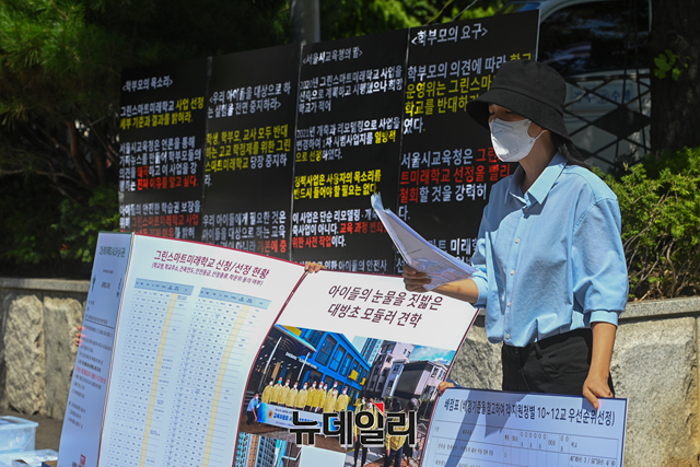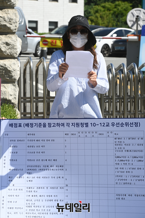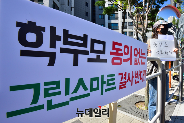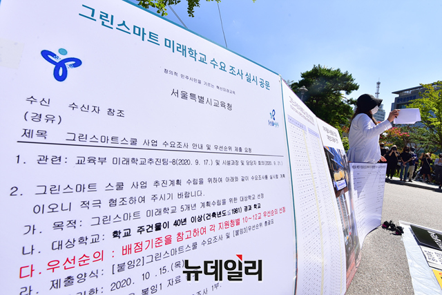 정부의 그린스마트 미래학교 정책을 반대하는 서울지역의 학부모들이 15일 오전 서울 종로구 서울시교육청 앞에서 교육청의 일방적인 지정을 규탄하는 2차 기자회견을 갖고 있다.학부모들은 "지금 교육부에서는 40년 이상 노후화된 학교들을 대상으로 그린스마트 미래학교라는 이름의 공간혁신(리모델링) 사업을 전면에 내세워 다급하게 사업을 강행하고 있다"며 "18.5조의 혈세를 쏟고 상세한 사전조사 및 시뮬레이션 없이 강행하는 그린스마트 미래학교의 일방적인 추진은 반드시 철회되어야"한다고 말했다.'그린스마트 미래학교'는 2025년까지 5년간 18조 5천억 원을 투입해 전국에 있는 40년 이상의 노후 학교를 개축 또는 리모델링하는 사업이다.