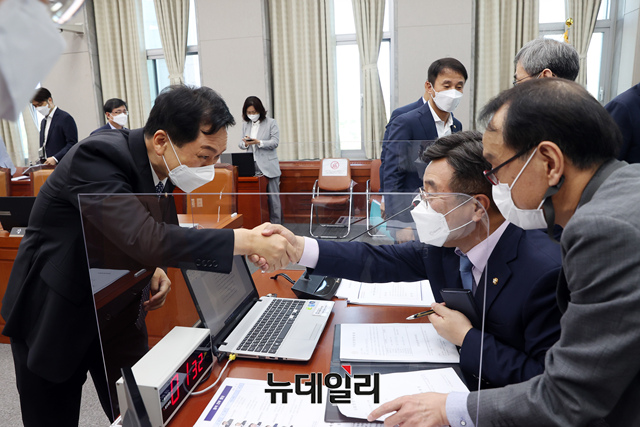 윤호중 더불어민주당 원내대표와 김기현 국민의힘 원내대표 15일 열린 국회 운영위원회 전체회의 산회 후 가 인사를 나누고 있다. (사진=국회사무처)