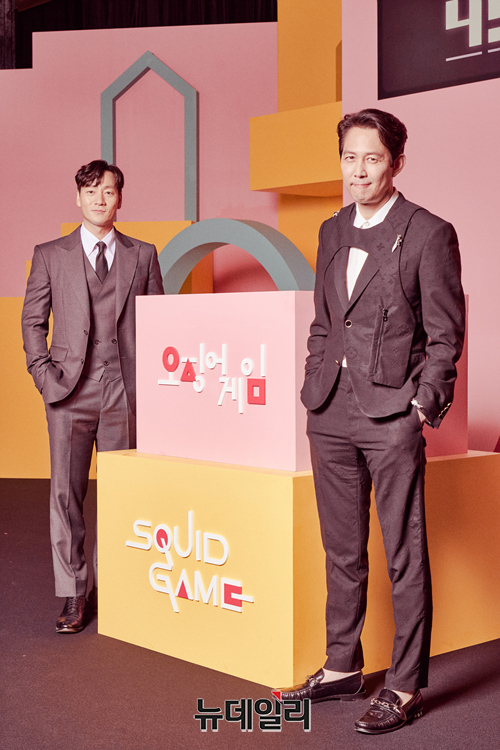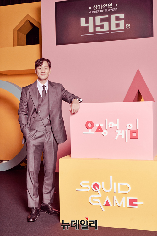 배우 박해수가 15일 오전 온라인으로 진행된 넷플릭스 시리즈 '오징어 게임(연출 황동혁)' 제작발표회에서 포즈를 취하고 있다.