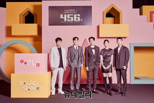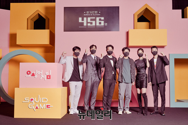 배우 허성태(왼쪽부터), 박해수, 이정재, 연출 황동혁, 배우 정호연, 위하준이 15일 오전 온라인으로 진행된 넷플릭스 시리즈 '오징어 게임' 제작발표회에서 포즈를 취하고 있다.
