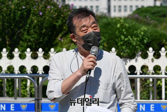 전국철거민협의회 중앙회가 15일 오전 국회 앞에서 '이재명 경기지사의 대장동 부동산 사업'을 규탄하는 기자회견을 하고 있다.