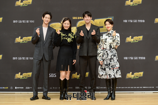배우 이원근(왼쪽부터), 이하늬, 연출 최영훈, 배우 이상윤, 진서연이 15일 오후 온라인으로 열린 SBS 새 금토드라마 '원 더 우먼' 제작발표회에서 포즈를 취하고 있다.