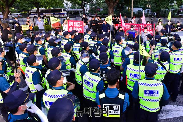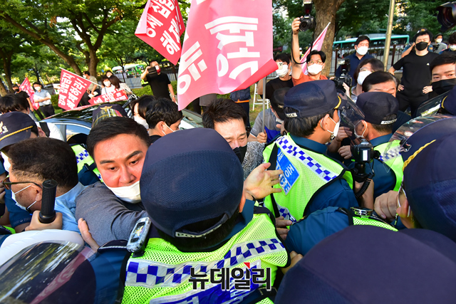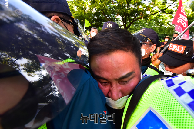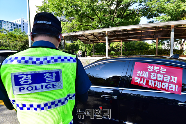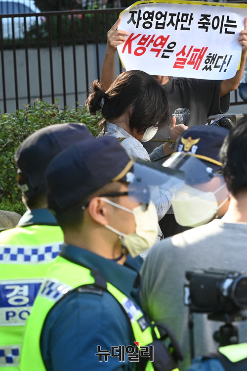 한국유흥음식업중앙회 소속 유흥음식점 업주들이 15일 오후 서울 여의도 국회 앞에서 열린 집합금지 해제 촉구 차량시위에서 경찰의 통제로 차량행진이 막히자 항의하고 있다.