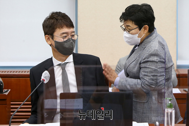 국민의힘 임이자 간사와 김웅 의원이 16일 국회에서 열린 환경노동위원회 전체회의에서 대화하고 있다. (사진=공동취재단)