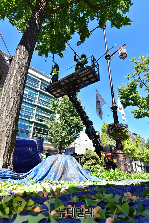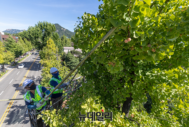 서울시 소속 조경과 직원들이 16일 오전 서울시 종로구 효자로 일대에서 은행나무 열매를 조기 채취하고 있다.