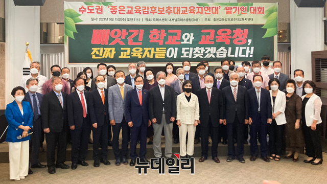 좋은교육감후보추대교육자연대(교육자연대)가 15일 오전 서울 중구 프레스센터에서 열린 수도권 '좋은교육감후보추대교육자연대' 발기인 대회에서 기념촬영을 하고 있다.