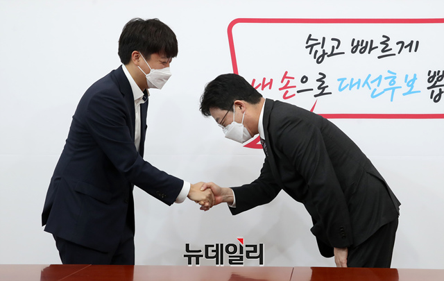이준석 국민의힘 대표가 17일 오전 국회에서 유승민 대선 경선 후보를 면담하며 악수하고 있다. (사진=공동취재단)