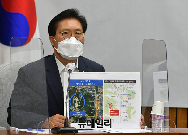 송석준 국민의힘 대장동 게이트 진상조사TF 위원이 17일 국회에서 열린 원내대책회의에 참석해 모두발언을 하고 있다. (사진=공동취재단)