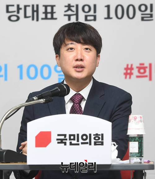 이준석 국민의힘 대표가 17일 오전 서울 여의도 국민의힘 중앙당사에서 취임 100일 기자간담회를 하고 있다. (사진=국회사진공동취재단)