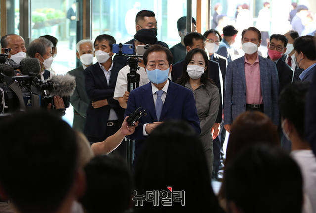 국민의힘 홍준표 대선 예비후보가 17일 오후 서울 강남구 남명학사 서울관을 찾아 학생들과 기념촬영을 하고 있다.