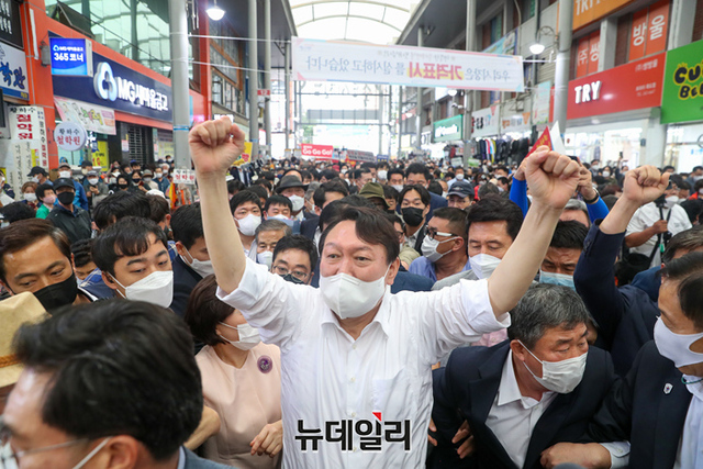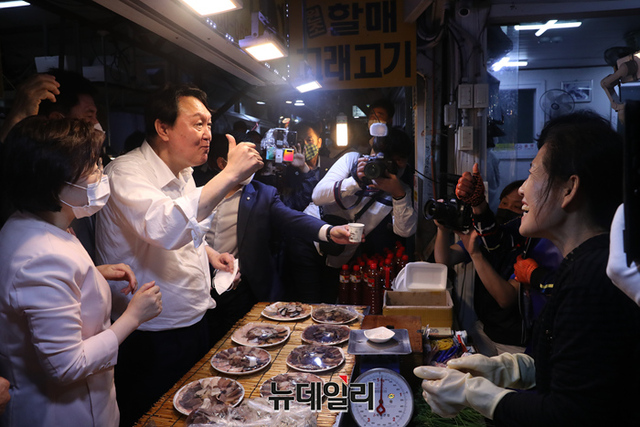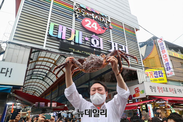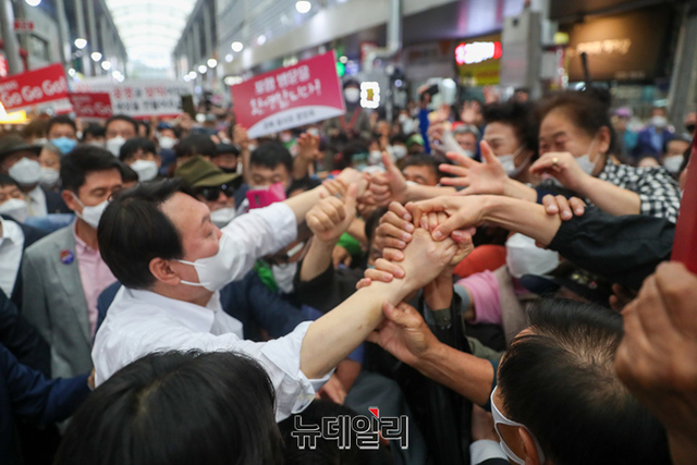 경북지역을 방문중인 국민의힘 윤석열 대선 예비후보가 17일 오후 포항 북구 죽도시장을 찾아 상인들과 인사를 나누고 있다. (사진=윤석열 캠프)
