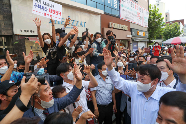 경남지역을 방문중인 윤석열 국민의힘 대선 예비후보가 18일 오전 경남 진주시 중앙유등시장을 방문해 시민들에게 손을 들어 인사를 하고 있다. (사진=윤석열 후보)