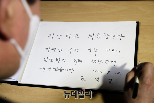 윤 후보는 '미안하고 죄송합니다. 자영업 구제 정책 반드시 실현하기 위해 정권교체 해내겠습니다'고 방명록을 남겼다.