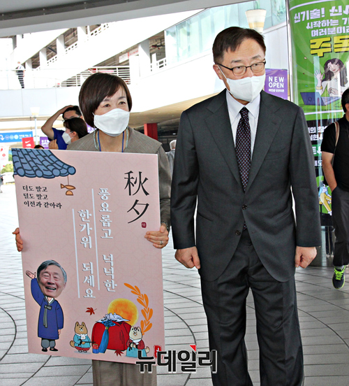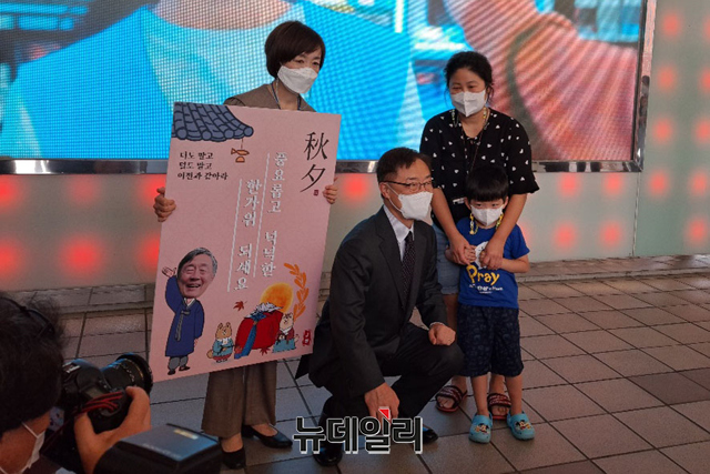 최재형 국민의힘 대선 경선후보가 19일 오전 서울역을 찾아 추석연휴 고향으로 향하는 귀성객들에게 인사를 하고 있다. (사진=최재형 캠프)