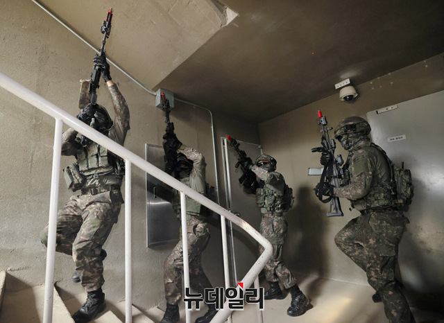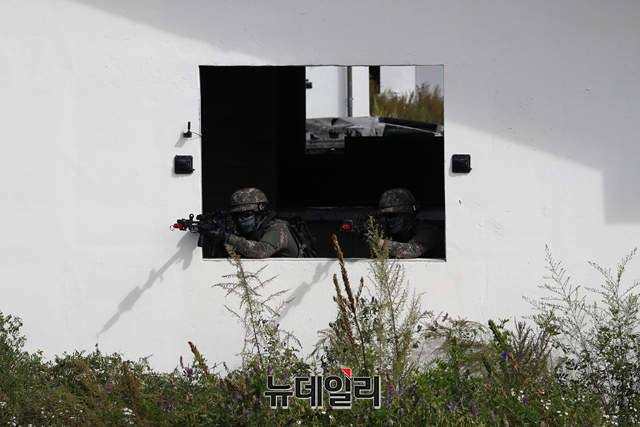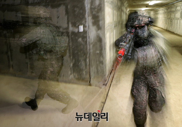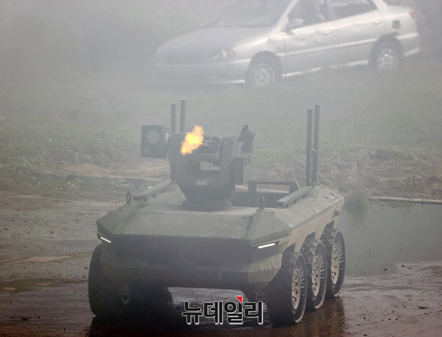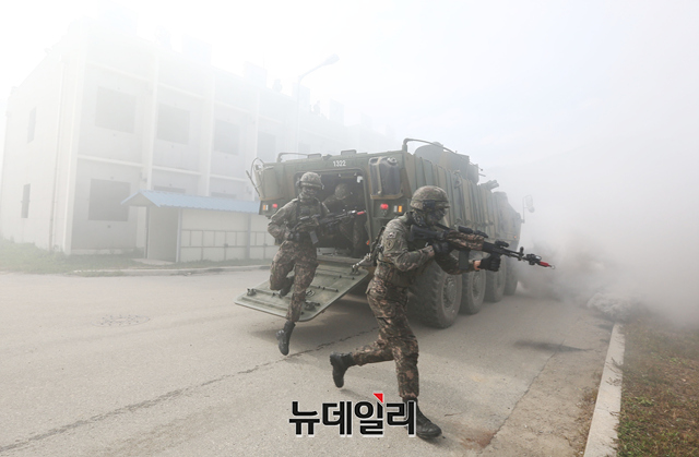 육군 장병들이 16일 오후 강원 인제군 육군과학화전투훈련단(KCTC)에서 'Army TIGER 4.0' 전투수행에서 적진 공격을 시연하고 있다.아미 타이거 4.0은 육군을 의미하는 영문 ARMY와 4차 산업혁명 기술로 강화된 지상군의 변화를 의미하는 Transformative Innovation of Ground forces Enhanced by the 4th industrial Revolution technology의 앞 철자를 딴 합성어다. 4.0은 4세대 첨단과학기술을 의미한다.육군은 "2023년까지 전투실험을 마치고 2024년과 2025년에는 치륜형장갑차 2개 대대 규모를 시험 운용한 후 사·여단급 부대를 대상으로 Army TIGER 4.0 단계적으로 확대하겠다"고 밝혔다. (사진=공동취재단)