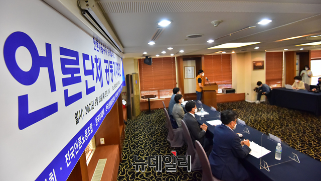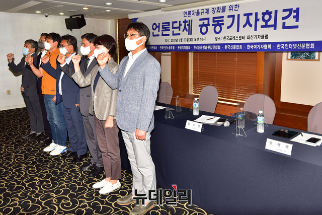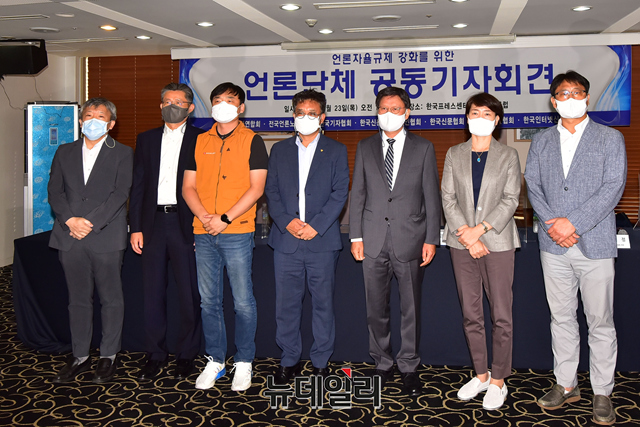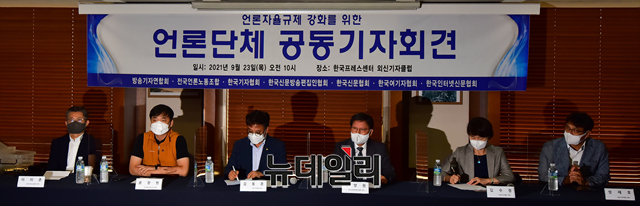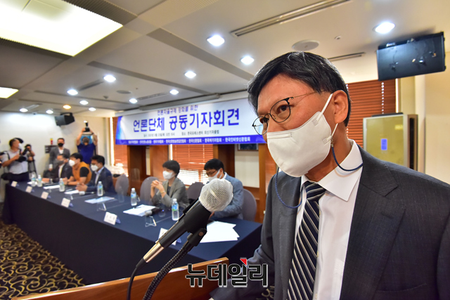 김동훈 한국기자협회장이 23일 오전 서울 중구 한국프레스센터에서 열린 언론자율규제 강화 언론단체 공동기자회견에서 공동성명서를 발표하고 있다.언론단체들은 "언론중재법 개정 강행 반대와는 별개로 언론 스스로 자정 노력을 통해 언론에 의한 피해를 방지하고 합당한 구제가 이루어질 수 있도록 노력하겠다"고 밝혔다.이날 행사에는 방송기자연합회, 전국언론노동조합, 한국기자협회, 한국신문방송편집인협회, 한국신문협회, 한국여기자협회, 한국인터넷신문협회가 참여했다.