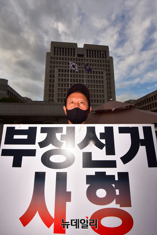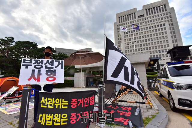 4.15부정선거국민투쟁본부(국투본) 회원이 23일 오후 서울 서초구 대법원 정문 앞에서 4.15총선의 부정선거 의혹 규명을 촉구하는 1인 릴레이 단식 시위를 하고 있다.
