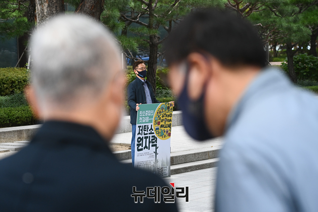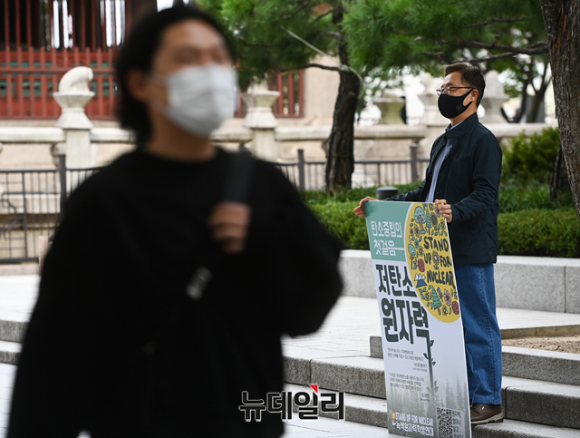 최재형 국민의힘 대선 예비후보가 25일 오전 서울 종로구 광화문광장 인근에서 정부의 탈원전 정책을 반대하는 1인시위를 하고 있다.